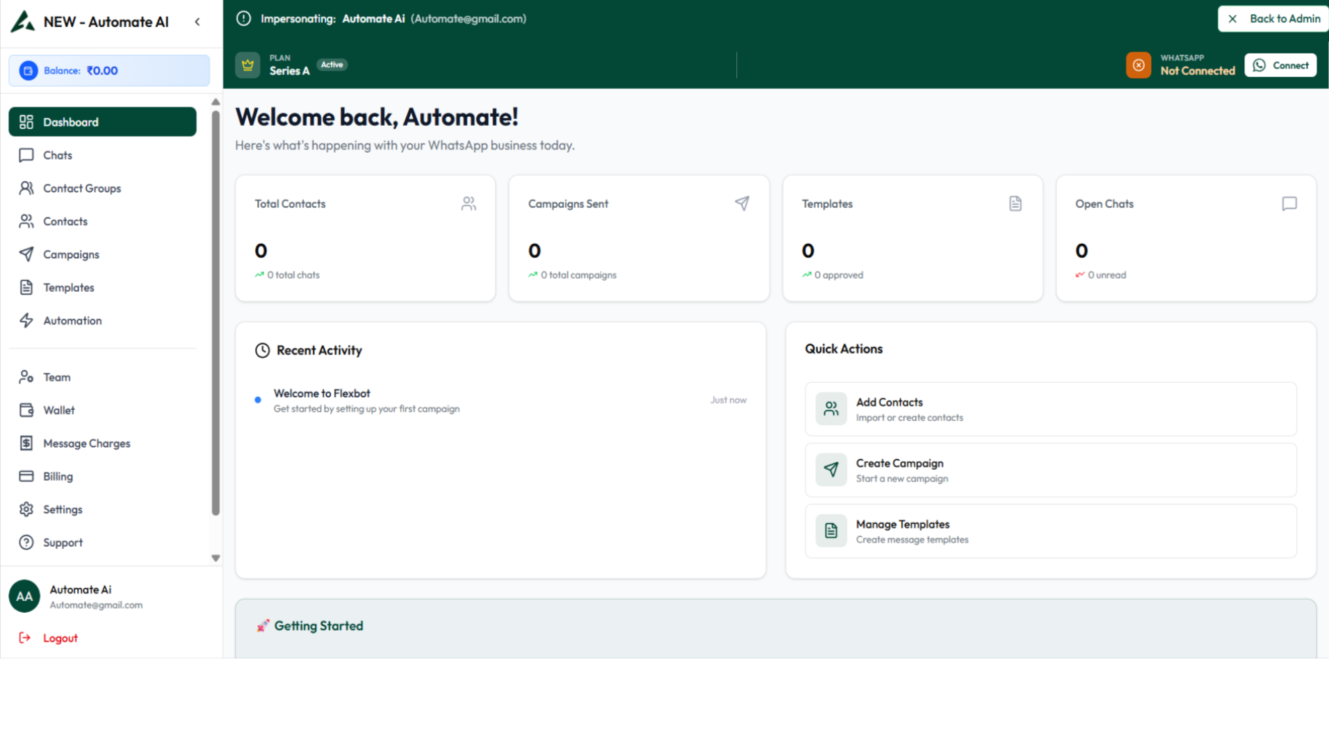 Build WhatsApp chatbots in minutes with Automate AI’s no-code, drag-and-drop flow builder.